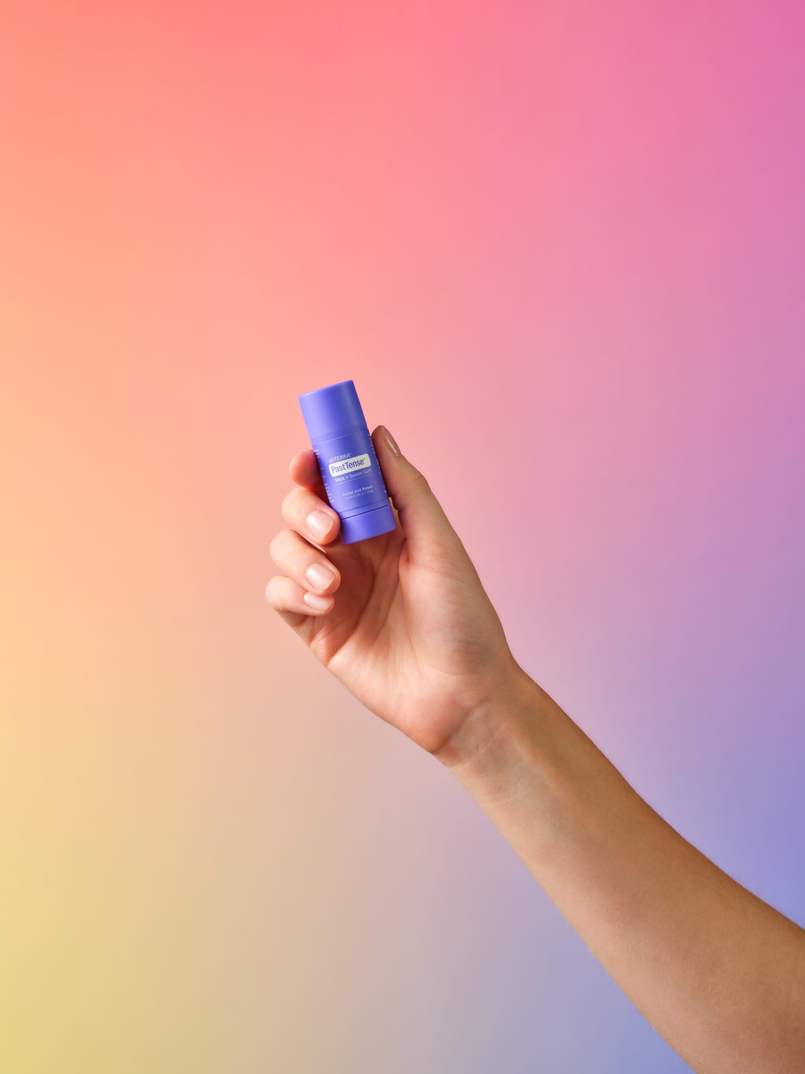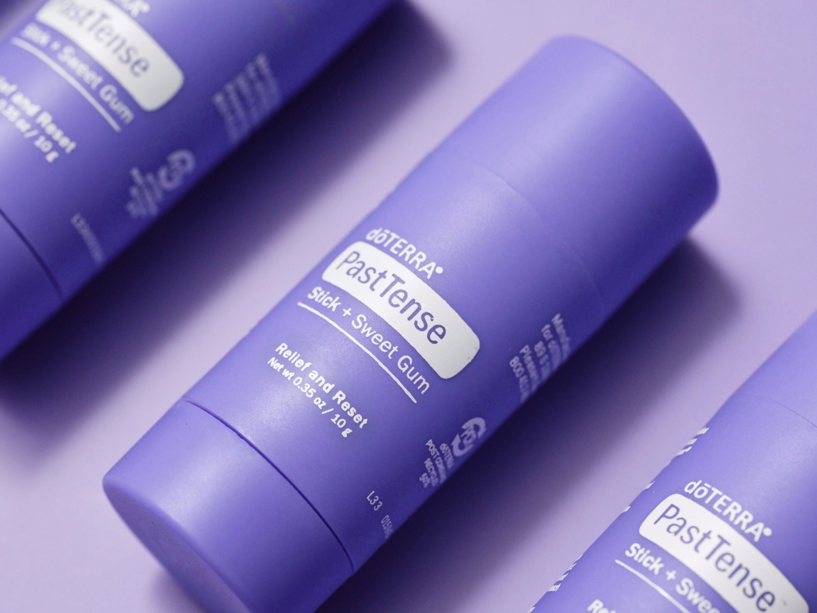 PastTense™ Stick + Sweet Gum is a mess-free, easy-to-use stick that can be conveniently applied throughout the day. It combines the classic PastTense® essential oil blend— Wintergreen, Lavender, Peppermint, Frankincense, Cilantro, Roman Chamomile, Marjoram, Basil, and Rosemary—with Sweet Gum essential oil, which is naturally high in beta- caryophyllene, a compound known for its calming properties.